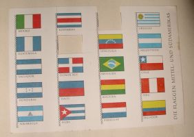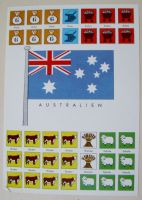 Überzähliges Sammelmaterial: zwei Mal Flaggentafel A (Neuseeland), ein Mal B (Australien) mit kleinen Kärtchen für Vieh und Bodenschätzen, dazu noch eine zerschnittene Flaggentafel.