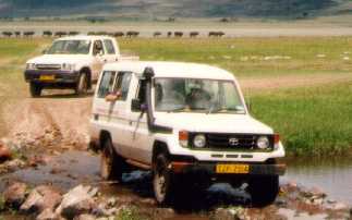 Zuerst geht die Fahrt steil bergauf zum Kraterrand. Weil hier immer Wolken hängen, wächst hier der typische Regenwald. Dann geht es wieder bergab. Auf dem Kraterboden ist die typische Savanne. Viele verschiedene Tierarten leben hier zusammen.