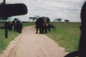 Wir machen uns auf den Rückweg. Kurz vor der Seronera Lodge geraten wir in eine gewaltige Herde von etwa 50 Elefanten. Wir sind überwältigt von diesem Anblick. Eigentlich sind Elefanten friedlich, aber zwei Bullen wollen ihre Jungtiere schützen und drohen uns unverhohlen. Als der Bulle eine schnelle Bewegung auf uns zu macht, gibt Samuel beherzt Gas. Einem Elefanten fährt man nicht so einfach davon, aber dem Bullen liegt nichts an einer Verfolgung.