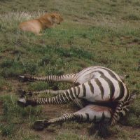 Doch der Führer hatte noch eine andere Besonderheit entdeckt: ein Rudel Löwen hatte ein Zebra erlegt. Die Beute blieb unter Bewachung einer Löwin zurück, während die anderen das Leittier holen. Erst wenn das Leittier gefressen hat, dürfen die anderen sich über das Zebra hermachen.